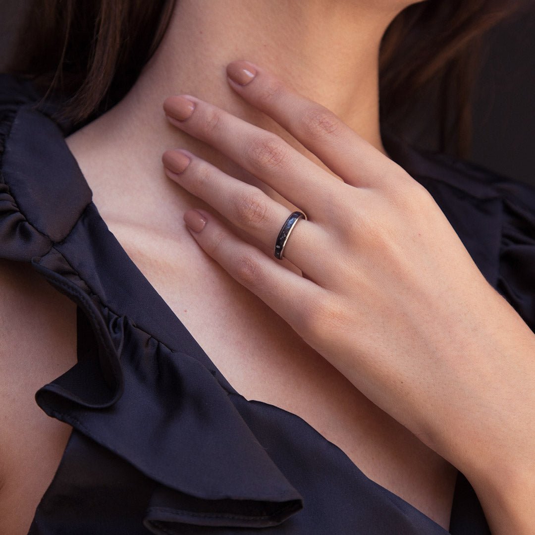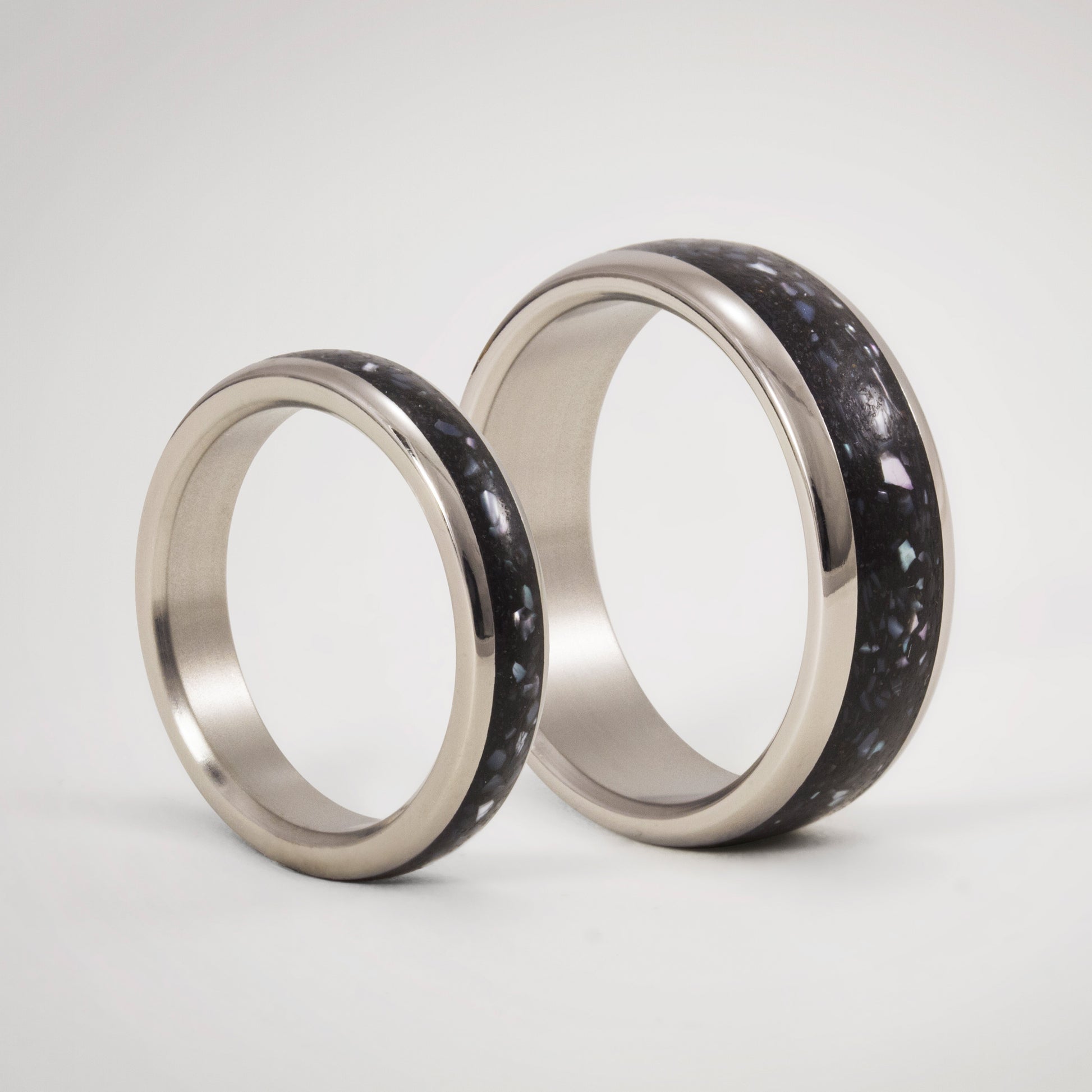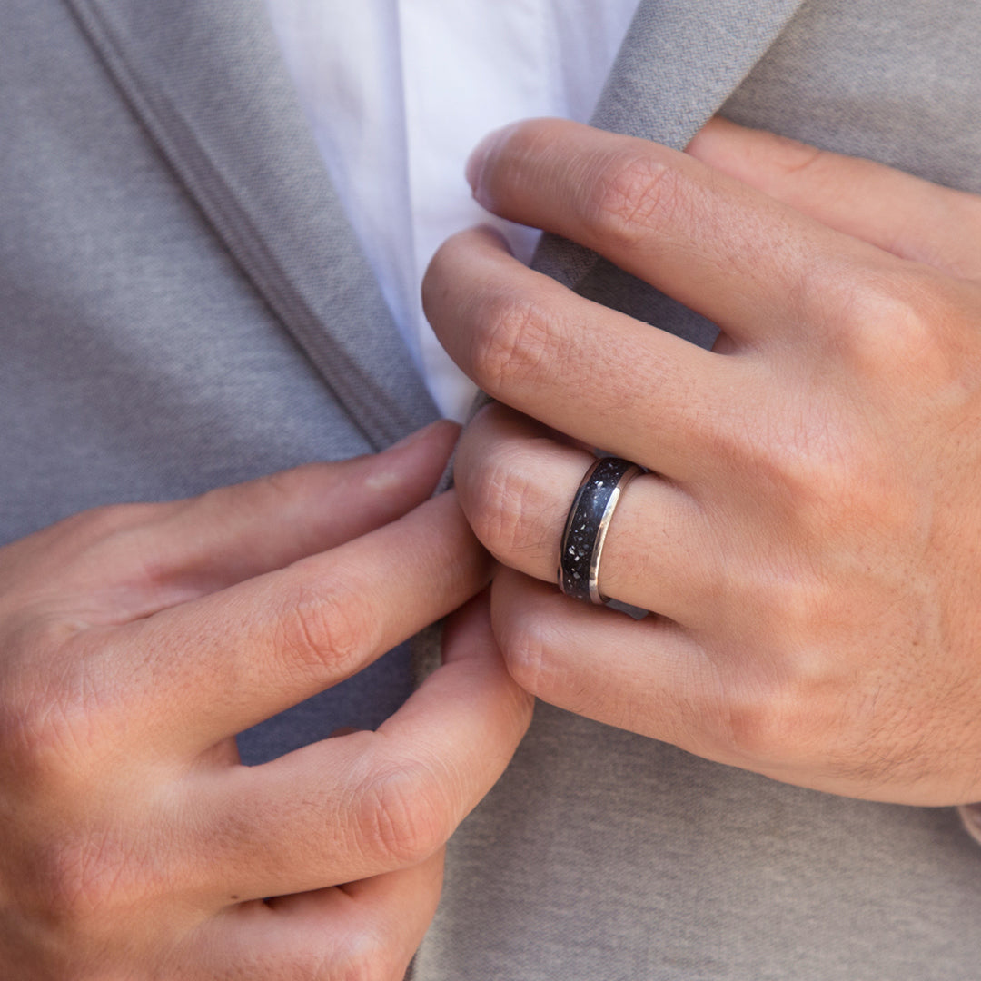 Este hermoso anillo de titano y concreto negro es la representación eterna del amor. El concreto negro habla de fuerza y carácter. Los chips de nácar reflejan la luz como pequeños recuerdos guardados en el alma. Y los bordes de titanio pulido abrazan la pieza con la delicadeza de un gesto que lo dice todo.