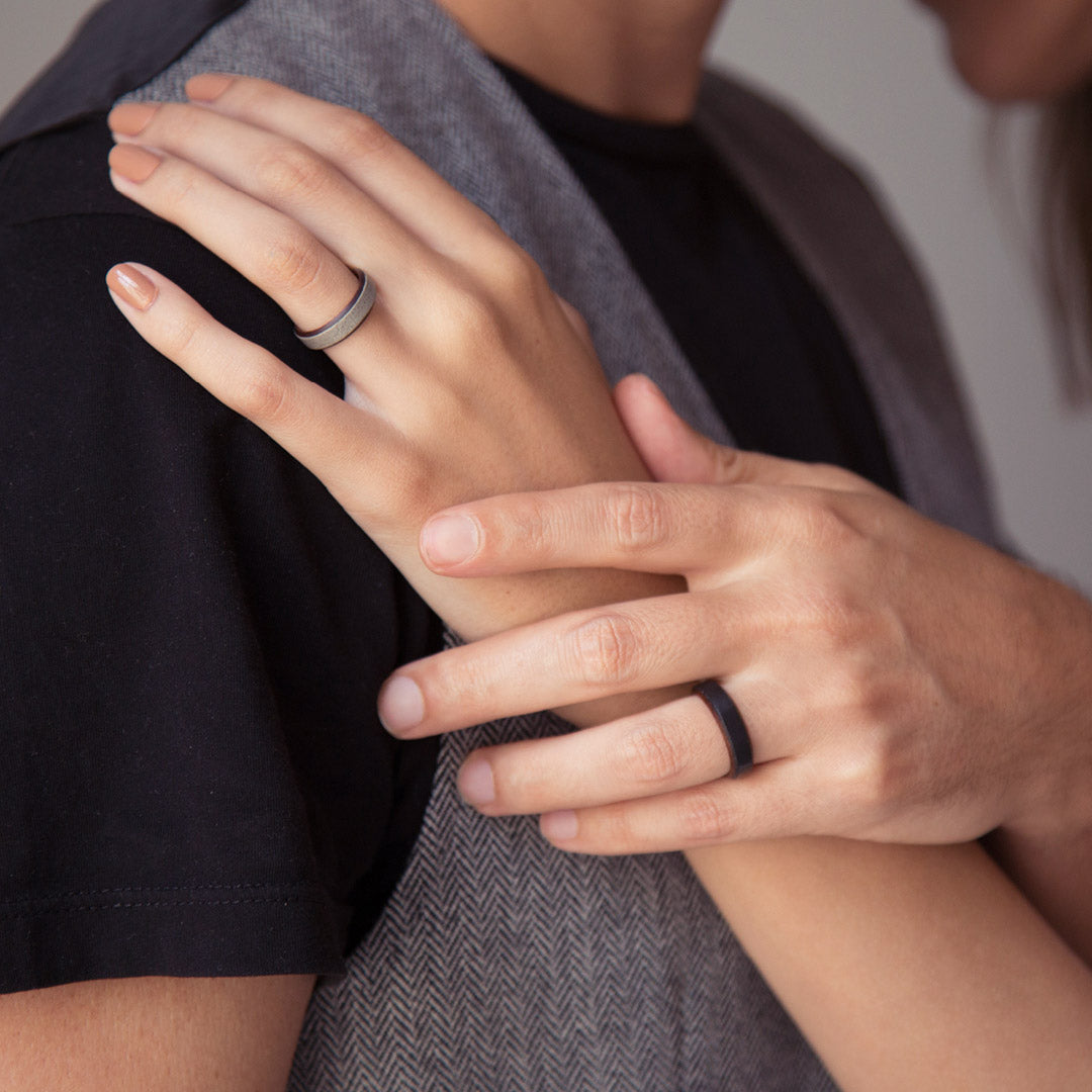 Nuestro anillo realizado sobre madera de incienso, distinguible por la singularidad de la veta y su tono de color, que se complementa con un recubrimiento exterior de cemento gris. Los bordes biselados y el sutil escalón que se forma entre ambas capas, son un indicio para imaginar que el anillo expresa una personalidad que ama lo natural.