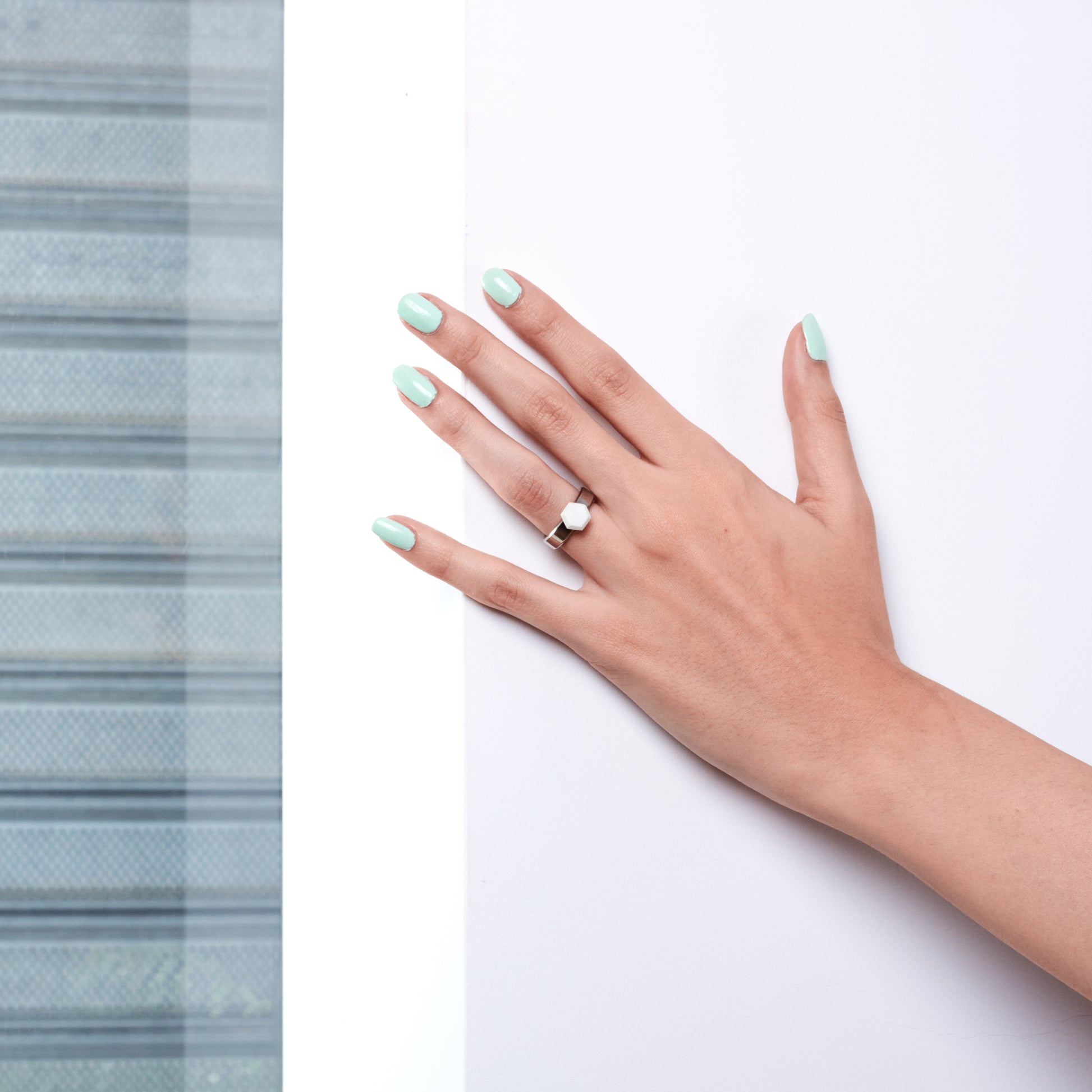 Perfecto para sellar un compromiso o celebrar un momento único. Este anillo ganador del Mejor Diseño Argentino, está pensado para marcar fechas especiales. Combina la pureza del mármol de Carrara tallado en forma de diamante, con la fuerza y la elegancia del titanio cepillado en su base.