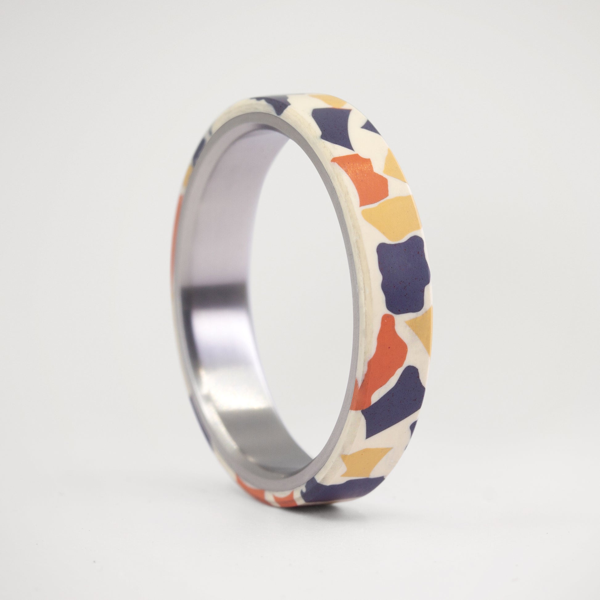 Este modelo, en tonos naranja, amarillo y azul, reinterpreta el espíritu del terrazo con una paleta alegre y contemporánea.