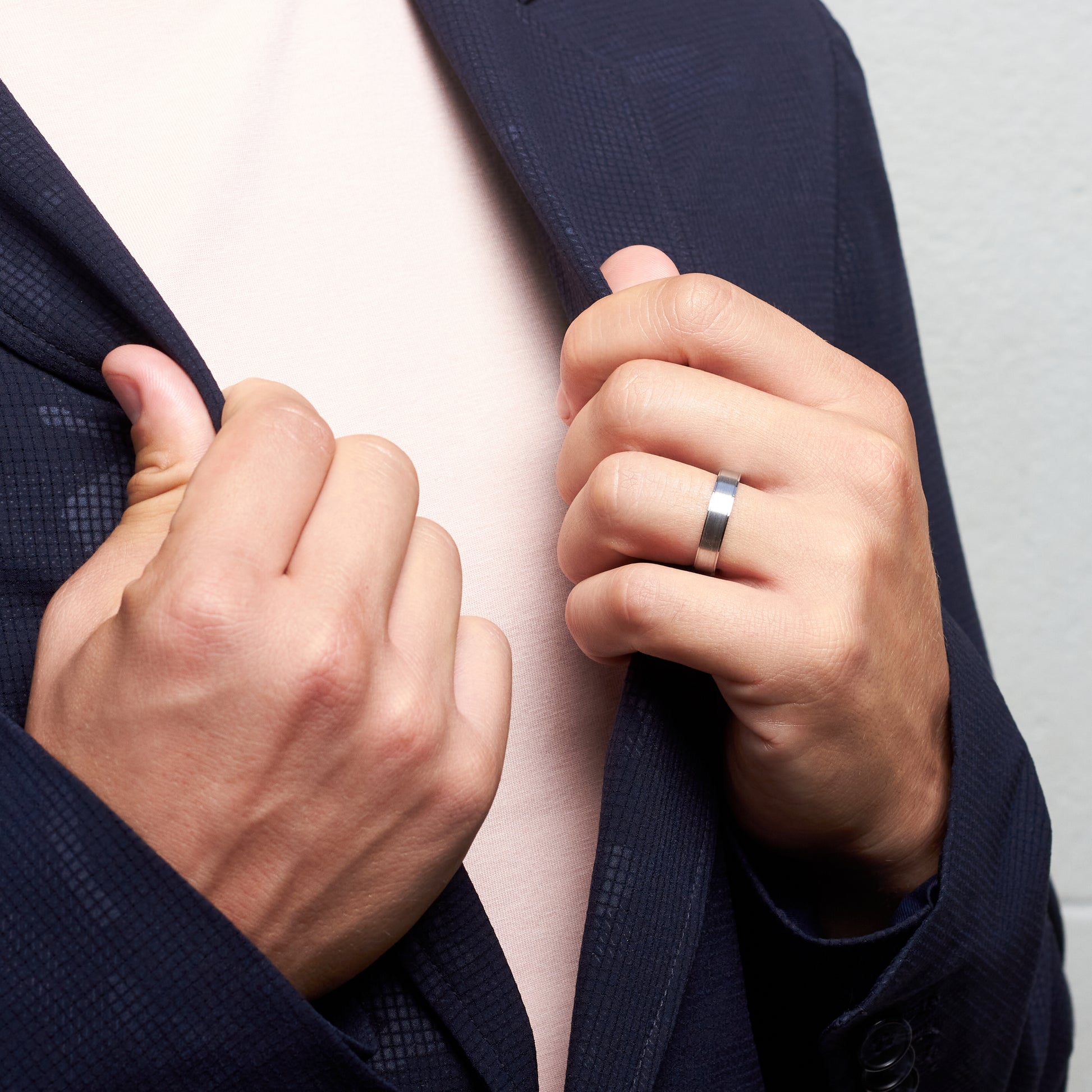 La evolución de la elegancia en cada detalle. Como esta belleza de anillo que está construido íntegramente en titanio y que combina dos terminaciones que se entrelazan en perfecta armonía, un centro cepillado que transmite fuerza y sobriedad, y bordes en bajo relieve pulidos que aportan un brillo delicado y sofisticado.