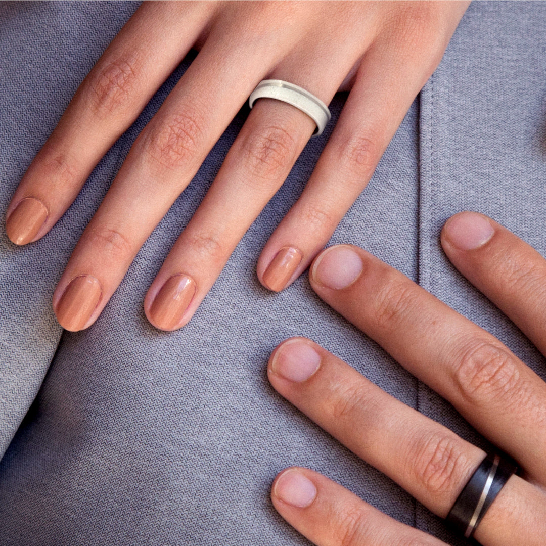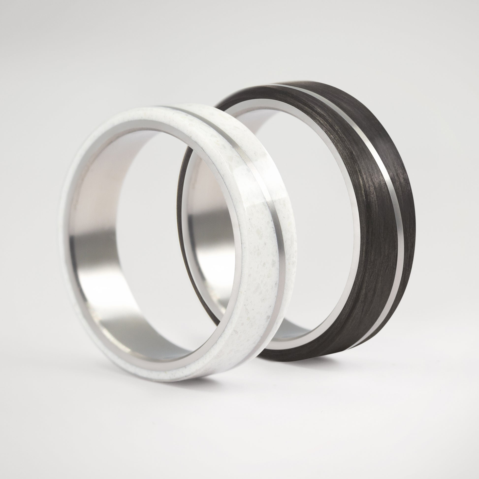 Cada anillo parte de un aro interior de titanio, que se complementa con dos recubrimientos exteriores, uno es de fibra de carbono y el otro es de mármol de Carrara reconstituido.